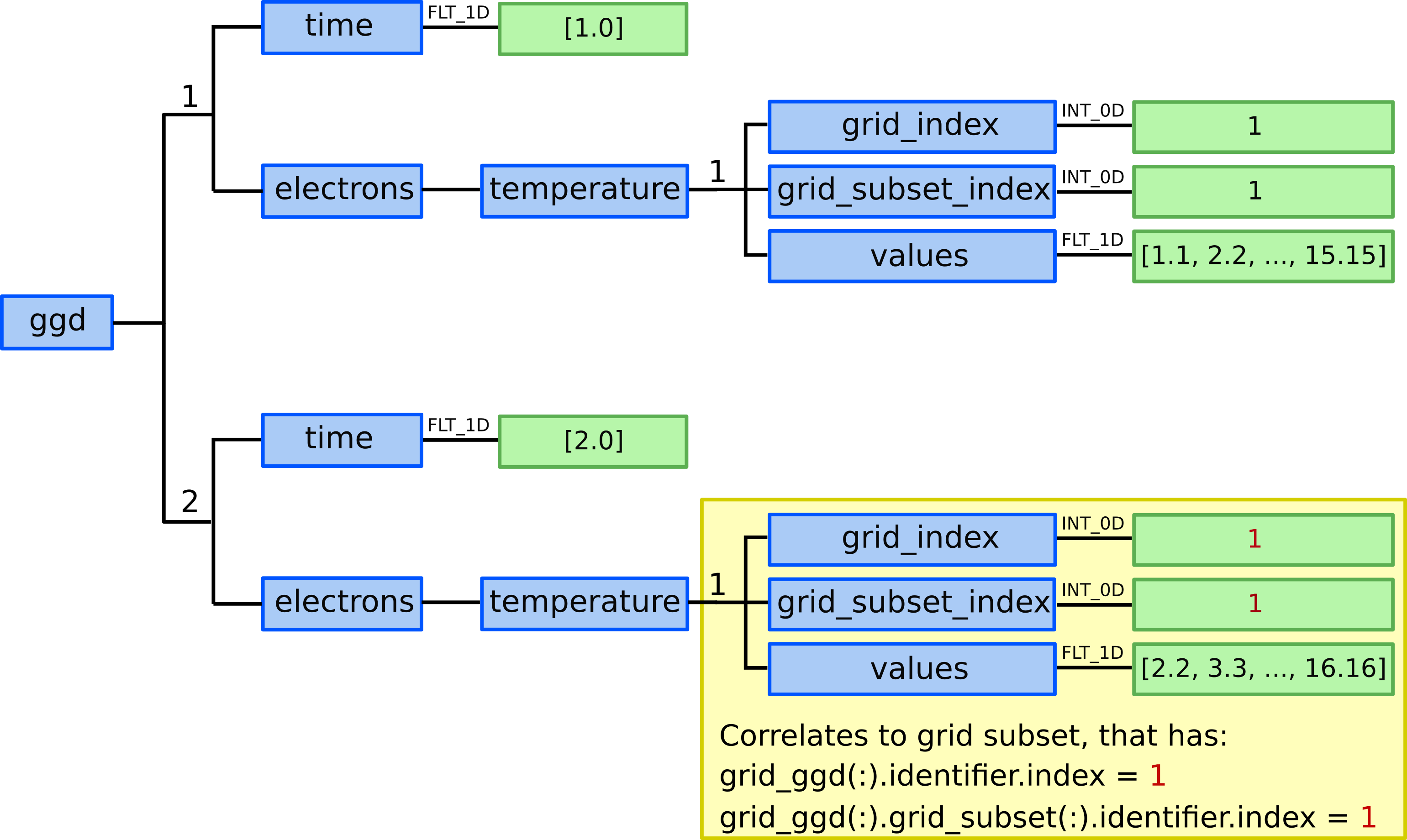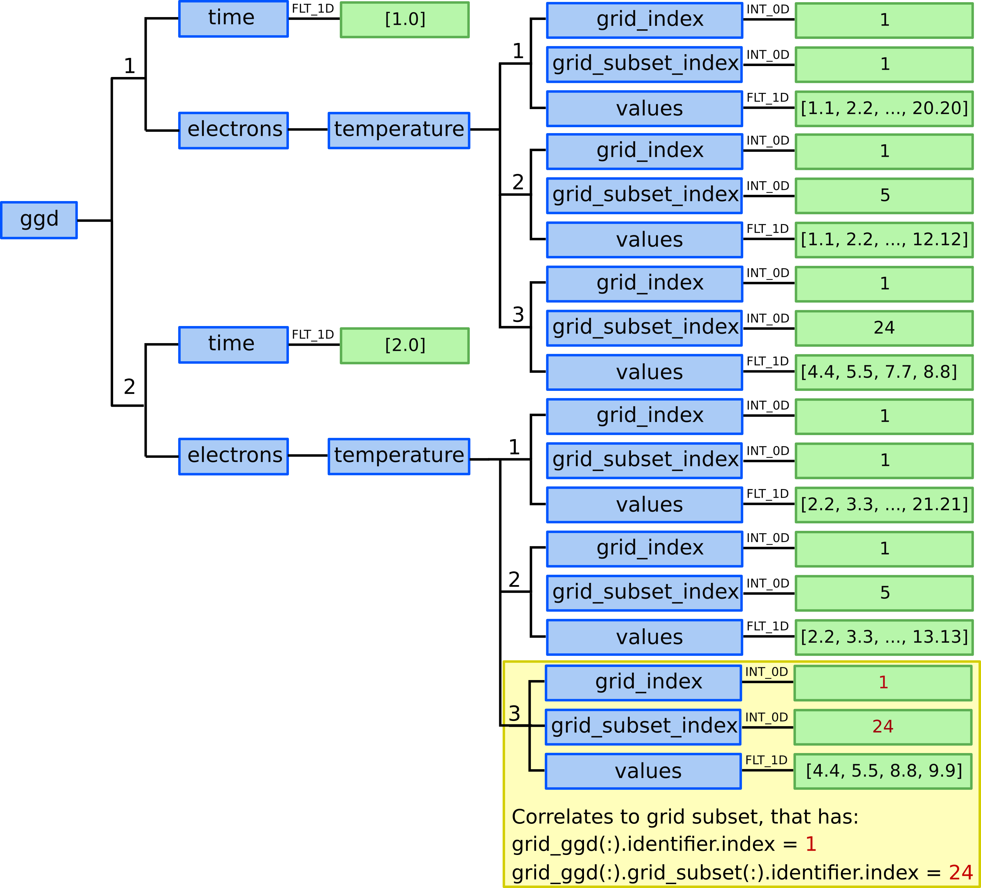ggd(1).electrons.temperature(1).grid_index= 1ggd(1).electrons.temperature(1).grid_subset_index= 1ggd(1).electrons.temperature(1).values= e.g. [1.1, 2.2, 3.3, 4.4] (one value per point)